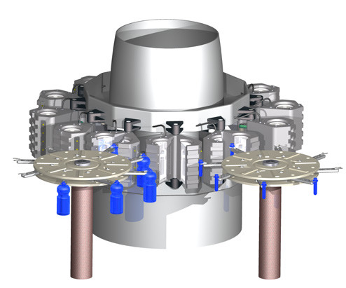 所谓的瓶子的预成型件通过输送系统被插入吹塑机中。该机器由一个用于预成型坯加热的线性加热模块和一个吹塑模块组成,在该模块中,加热的预成型坯被吹塑成瓶子。瓶坯最初通过加热器以达到弹性。下一步是将预成型坯转移到吹塑模具中。为了固定并居中,使用液压胀紧套固定传输轮。采用单螺杆设计,快速简便的安装和调节就形成了一个关键优势。