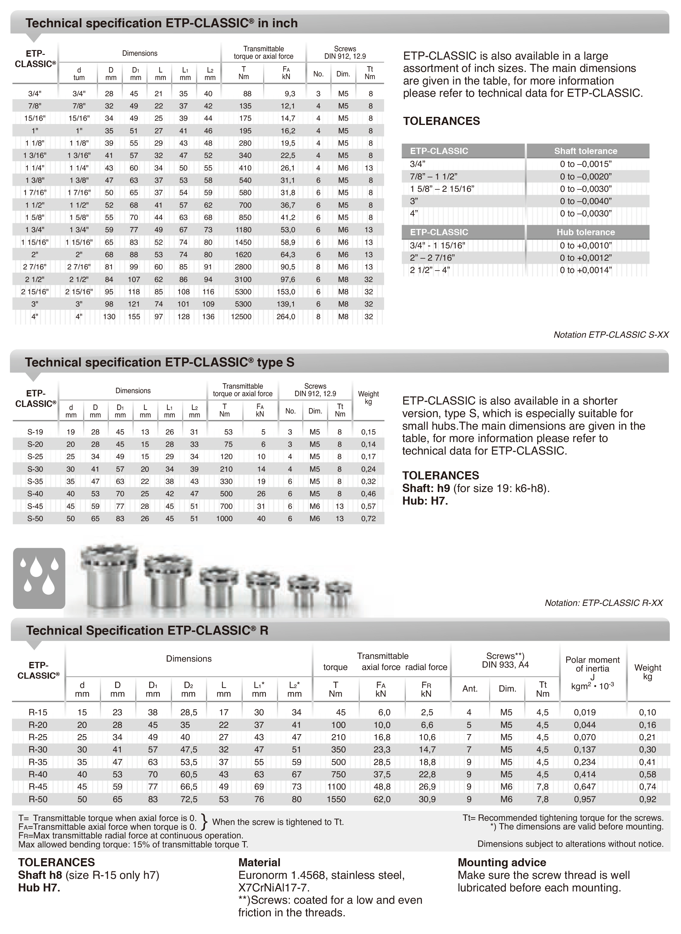 ETP-CLASSIC is available as standard for shafts 15-100 mm, also imperial and a short version, (type S). Also available in stainless steel ( type R). Runout: 0,03 – 0,06 mm. Number of mountings: 100 (type R: 50). The small number of clamping screws with low tightening torque, makes the mounting/ dismantling procedure fast and easy.