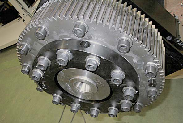 这台印刷设备中的一个用软纤维制成的特殊齿轮也是用ETP-TECHNO传动的。这是由于它对传动件表面所产生的压力均匀适中,因而不会损坏这种特殊的齿轮。同时,液压联轴器径向跳动小、动平衡好的优点也在很大程度上减少了设备运行时的噪音。