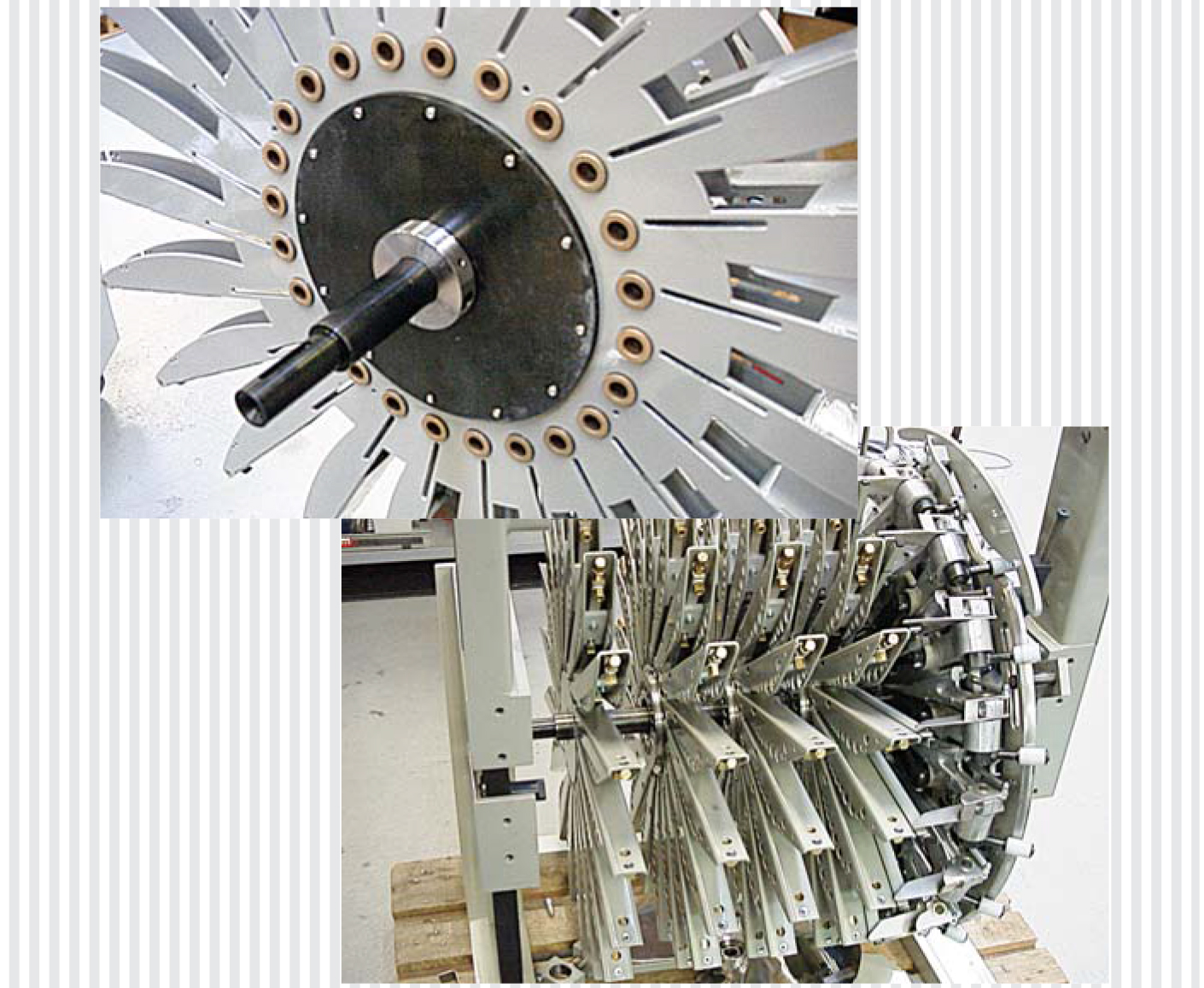 这是一条在印刷和折叠好的报刊内插放副刊或增刊的作业线。用 ETP-EXPRESS 将许多星形分拣轮沿着机轴的长度方向与轴连接。由于星形分拣轮的排放非常紧凑,必须采用这类能够从径向操作的液压胀紧套。此外,该应用条件还要求液压胀紧套具有径向和端向跳动小、以及震动小等特点。