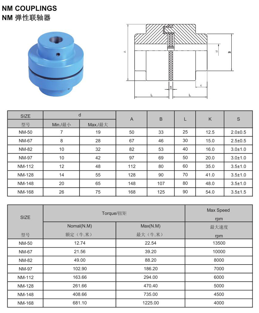 NM弹性爪式联轴器,也叫凸爪型联轴器。结构上类似弹性梅花联轴器,采用特殊设计合成橡胶, 带两个铸铁材料相似主体,橡胶式联轴器NM系列.主要为两个铸铁(FC25材质)本体加上橡胶的联轴器,橡胶式联轴器NM系列为(FC25)的铸铁,加上中间的橡胶为缓冲垫.所組成的联轴器,为泵于马达的连接零件,一般机械上也常为使用 。